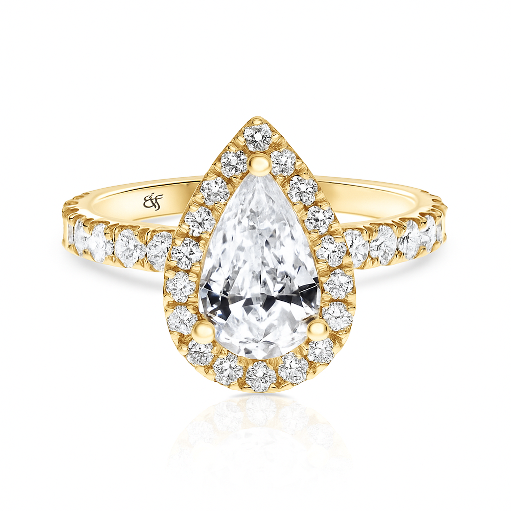 14/18 K gold ring set with a center pear shape diamond & round diamonds
